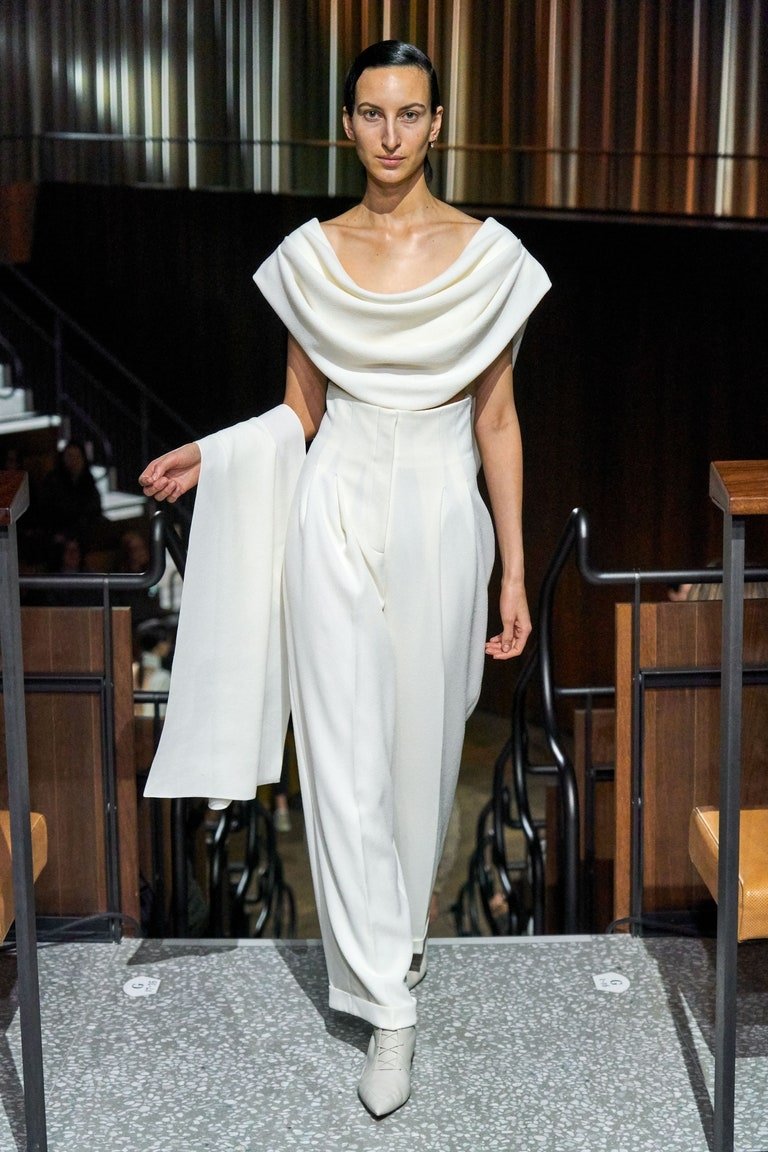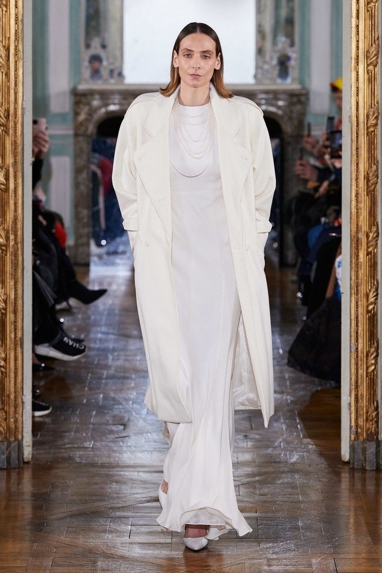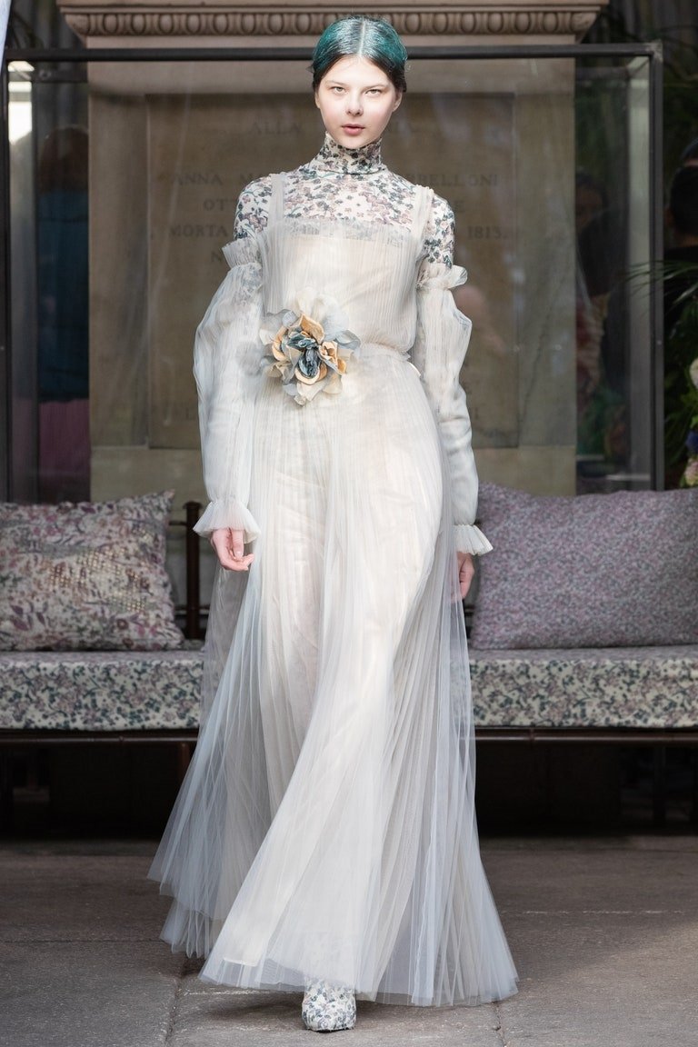 Дизайнер сочетает нежный шелк с вышивкой и топ с цветочным принтом и высокой горловиной. Вдохновением коллекции стал образ романтичного зимнего сада.