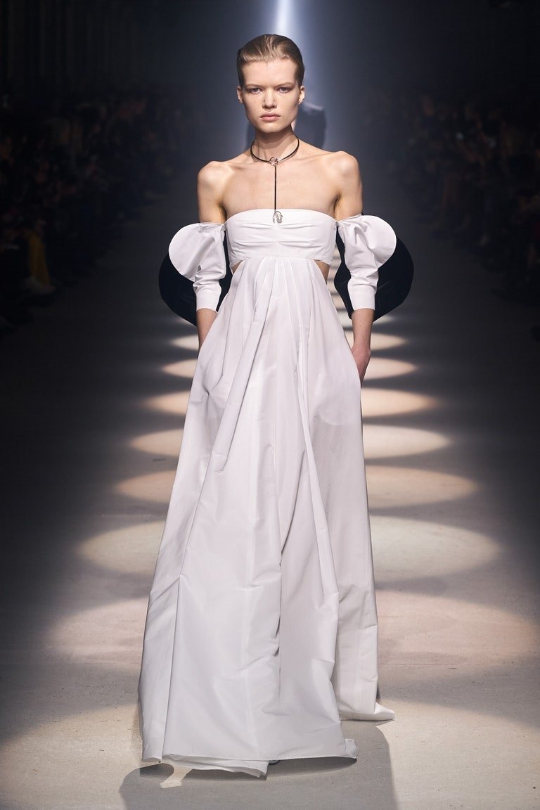 Дизайнер создала роскошное платье с оптической иллюзией (сочетание черного и белого цветов на рукавах), пышной юбкой и прямым вырезом, который полностью оголил плечи.