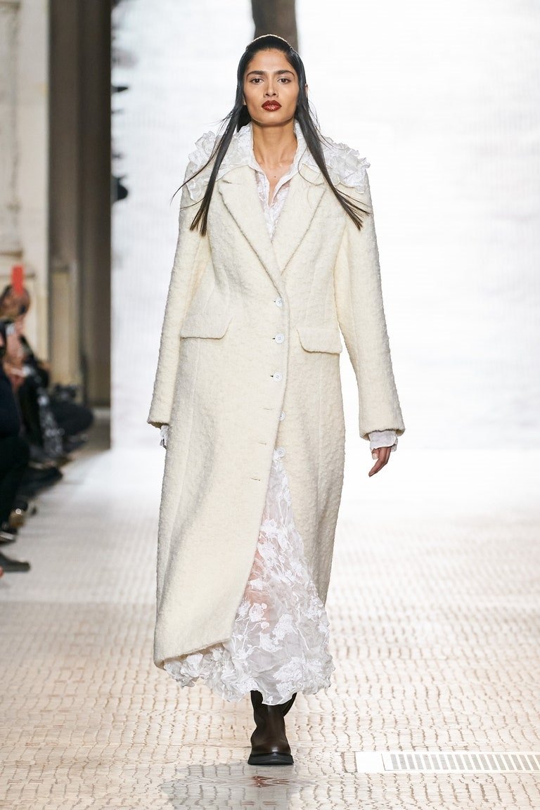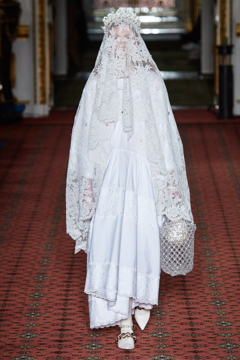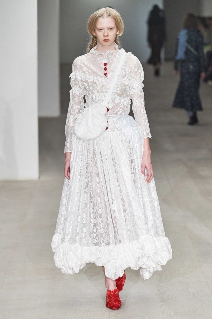 В коллекциях сезона осень-зима 2020 присутствует очень много готических мотивов, и показ бренда Yuhan Wang – не исключение. Платье из гипюра с пышной юбкой и рюшами – яркий показатель готического стиля.