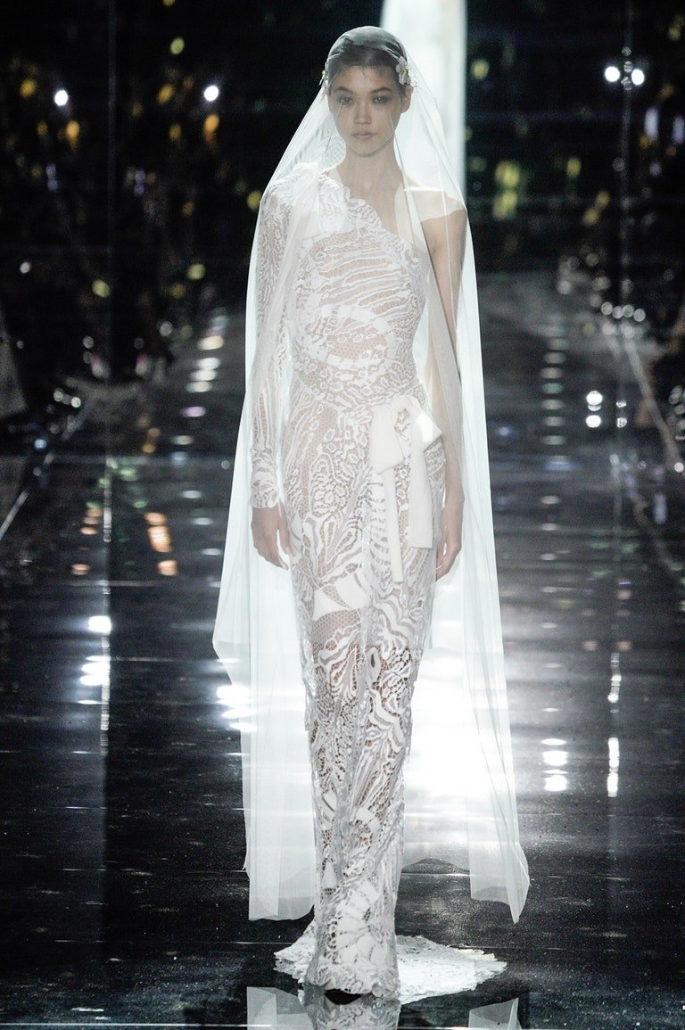 Дизайнер Том Форд предложил модель платья из гипюра с длинной фатой из простой органзы.