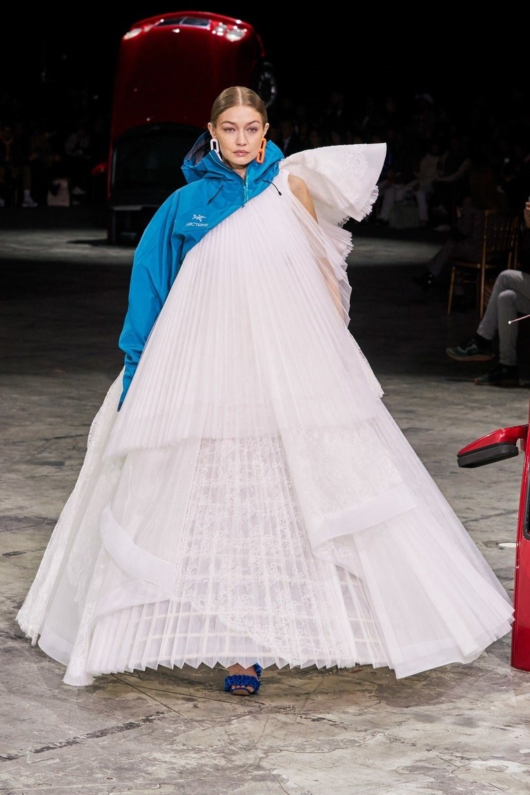 Бренд решил сделать невероятное: соединить спортивный стиль со свадебным платьем. Огромный конус из фатина с вышивкой контрастирует с синей курткой, часть которой пришита к каркасу конуса. Эпатажно и стильно!