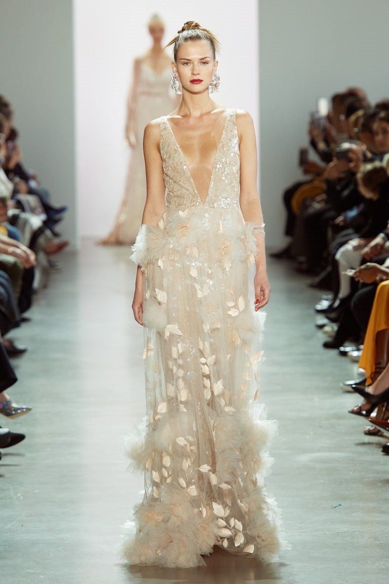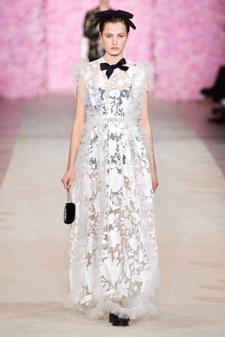 Дом моды предложил сочетание трех роскошных деталей: цветочных аппликаций, фатина и нежного белого шелка.