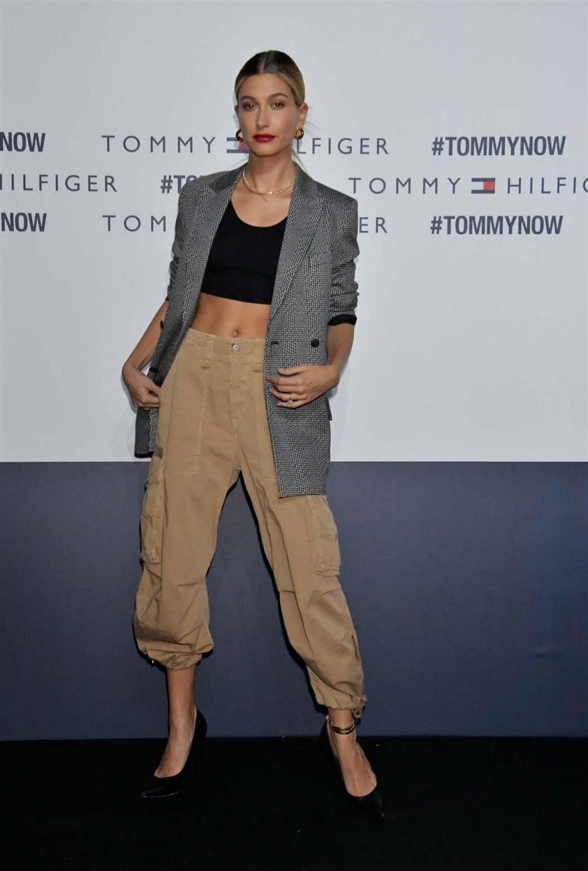 Мы уже говорили о том, что пиджак XXL нужно сочетать с облегающими и темными штанами.Только так вы будете выглядеть стройнее. Посмотрите на Хейли Болдуин, она сделала совсем противоположное. Хейли выбрала пиджак XXL (который не подходит к ее плечам) и объемные спортивные штаны.