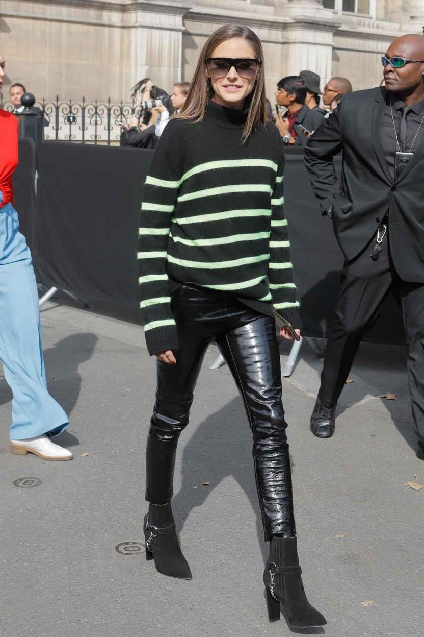 Этот образ Оливии Палермо станет идеальным для тех, кто хочет казаться стройнее. Он выглядит очень стильно, сексуально и привлекательно. Если хотите, чтобы ноги выглядели худыми, выбирайте штаны темных тонов, например, как эти виниловые леггинсы Оливии Палермо. Сочетайте кожаные штаны и туфли того же цвета. Для верхней части нужно выбирать широкие свободные вещи, как этот свитер в полоску. В этом сезоне мир моды радует нас новыми принтами! Так что выбирайте тот, который вам нравится больше всех. Это не только очень удобный образ, но и теплый.