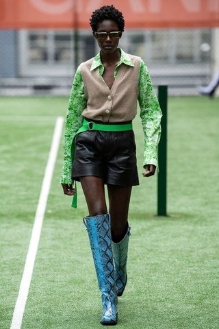 И еще один популярный бренд среди стилистов и модных экспертов. Ganni сделал акцент на индивидуальности каждого образа, которая проявилась в неожиданных сочетаниях, в платьях миди с принтами, просторных блузах, кожаных шортах (одна из главных вещей показа) коричневого, лилового и зеленого цвета. Кстати, именно эти цвета определили трендовую цветовую гамму сезона весна-лето 2020. В коллекции этого бренда сложно выделить определенный стиль. Здесь самое главное – сочетание кожаных шорт с рубашками и жилетками, которое напоминает вызывающий школьный образ. Да, стиль trad сохранит популярность на несколько сезонов.