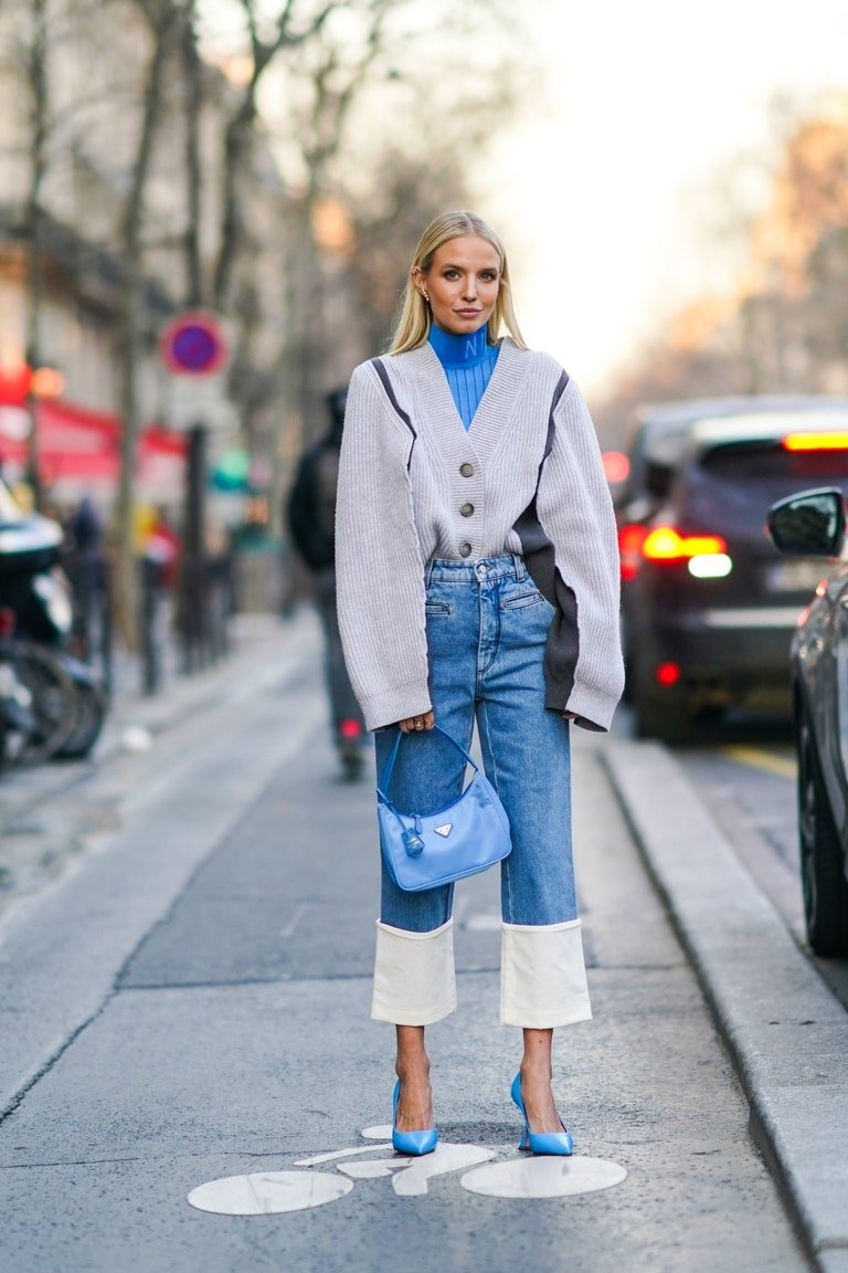 Продолжаем тему нестандартных джинсов. И предлагаем посмотреть на еще один стильный образ, подсмотренный на Неделе моды в Париже. Голубой – главный цвет в этом образе: свитер с высокой горловиной, нейлоновая сумка, кардиган грязно-голубого цвета, сумка и туфли на каблуке. Основной акцент – голубые джинсы на высокой талии с белыми вставками снизу. Благодаря обуви на каблуке, высокой талии и белым вставкам, ноги выглядят длинными и стройными.