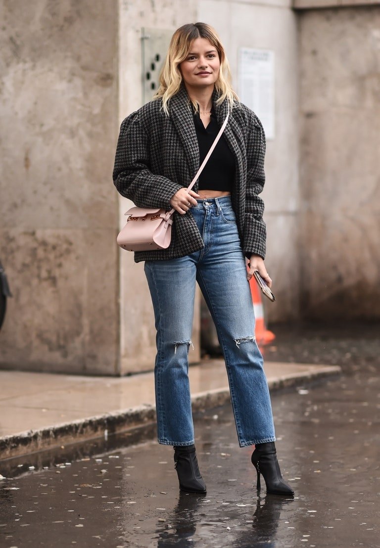 Образы парижского стритстайла – это не всегда яркие цвета и необычные фасоны. Есть и более сдержанные наряды, которые идеально подходят для ежедневных и офисных образов. Чтобы воссоздать наряд, что на фото, нужны всего лишь базовые вещи. Они точно должны быть в вашем гардеробе. Сабина выбрала прямые джинсы с разрывами на коленях, черный топ и пиджак с принтом в клетку. Она предпочла черные ботинки на высоком каблуке и маленькую розовую сумочку. Пиджак с объемными плечами – тренд сезона, так что он обязательно должен быть у вас в шкафу. Ну а розовая сумка создает весенний контраст в довольно темном наряде.