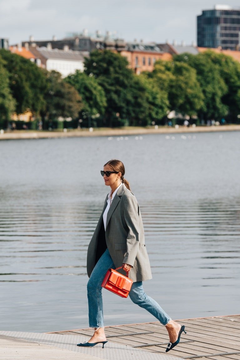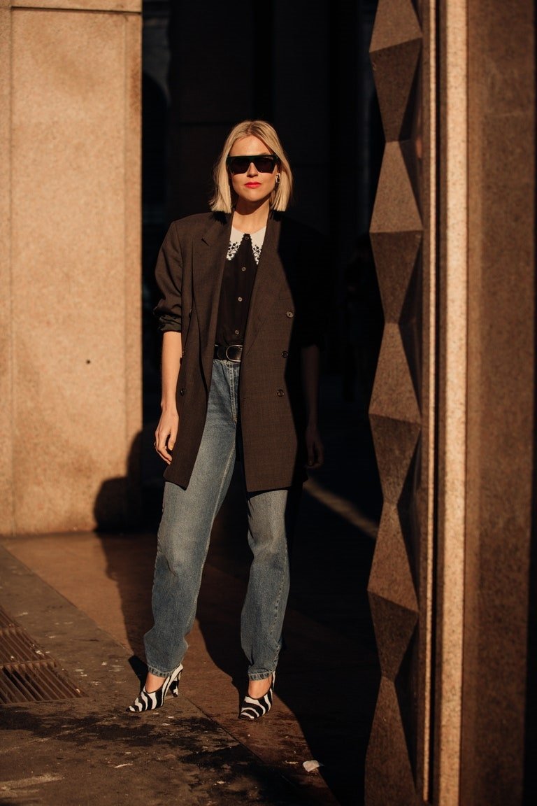 Этот образ от Нины Сандбич выглядит очень необычно. Здесь работают не только туфли без задника с украшением со страз или яркая сумка. Это сочетание базовых вещей с трендовыми и создает гармоничный, стильный образ. А что может быть лучше, чем сочетание пиджака оверсайз, белой рубашки и джинсов? Эти вещи уже давно должны быть в вашем шкафу, ведь они входят в список из 15-ти вещей идеального весеннего гардероба.