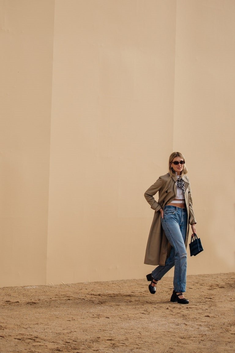 Сочетание классических и оригинальных вещей всегда получается очень удачным. Еще одна фешн-блогер порадовала образом с идеальным соединением этих двух стилей. Прямые джинсы (с разрывами на коленях), бежевый плащ, платок на шее и элегантная сумка квадратной формы относятся к базовым вещам и классическому стилю. Контраст создает белый топ и туфли на небольшой платформе и широком каблуке. Несмотря на такое неожиданное сочетание, наряд в целом выглядит гармонично и стильно.