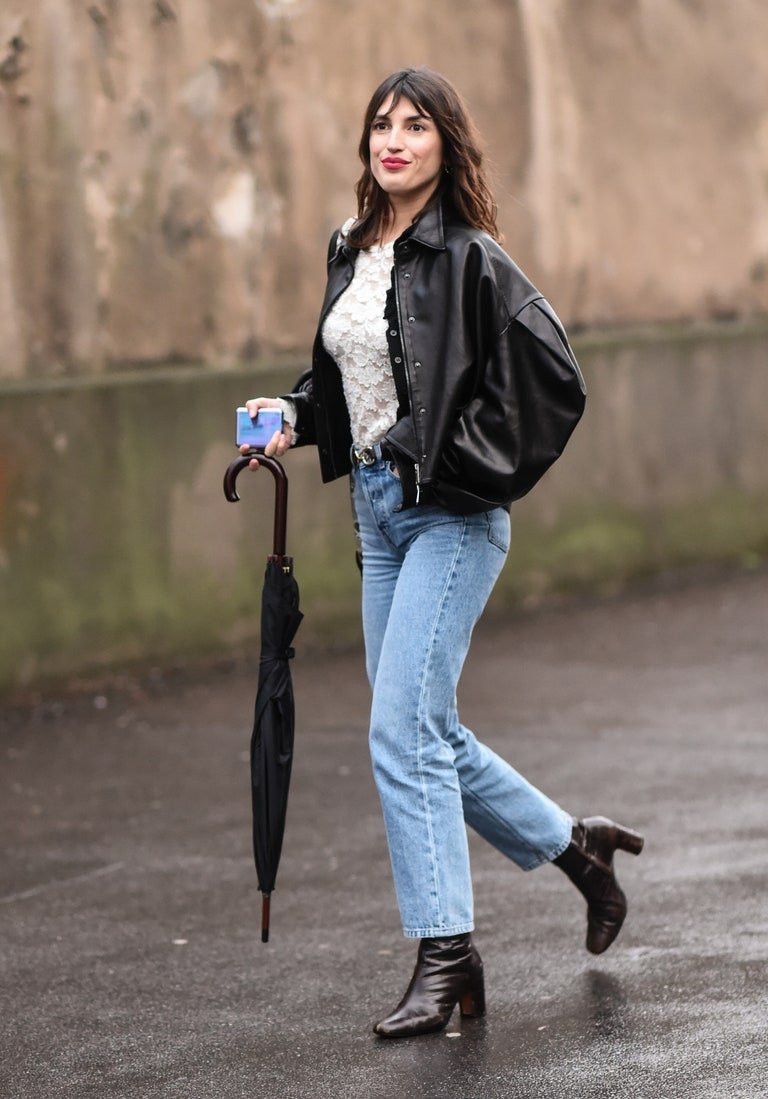 Ну и как тут обойтись без Джин Дамас. Эта знаменитая фешн-блогер придаст нотку французского стиля в любой наряд. Даже если он создан на основе простых джинсов. На этот раз Джин предпочла сочетание белого топа с кружевом, кожаной куртки черного цвета и светлые джинсы прямого кроя. Куртка с объемными рукавами придает образу винтажности, а это сейчас в моде... Ну и не забывайте про ботинки на каблуке.