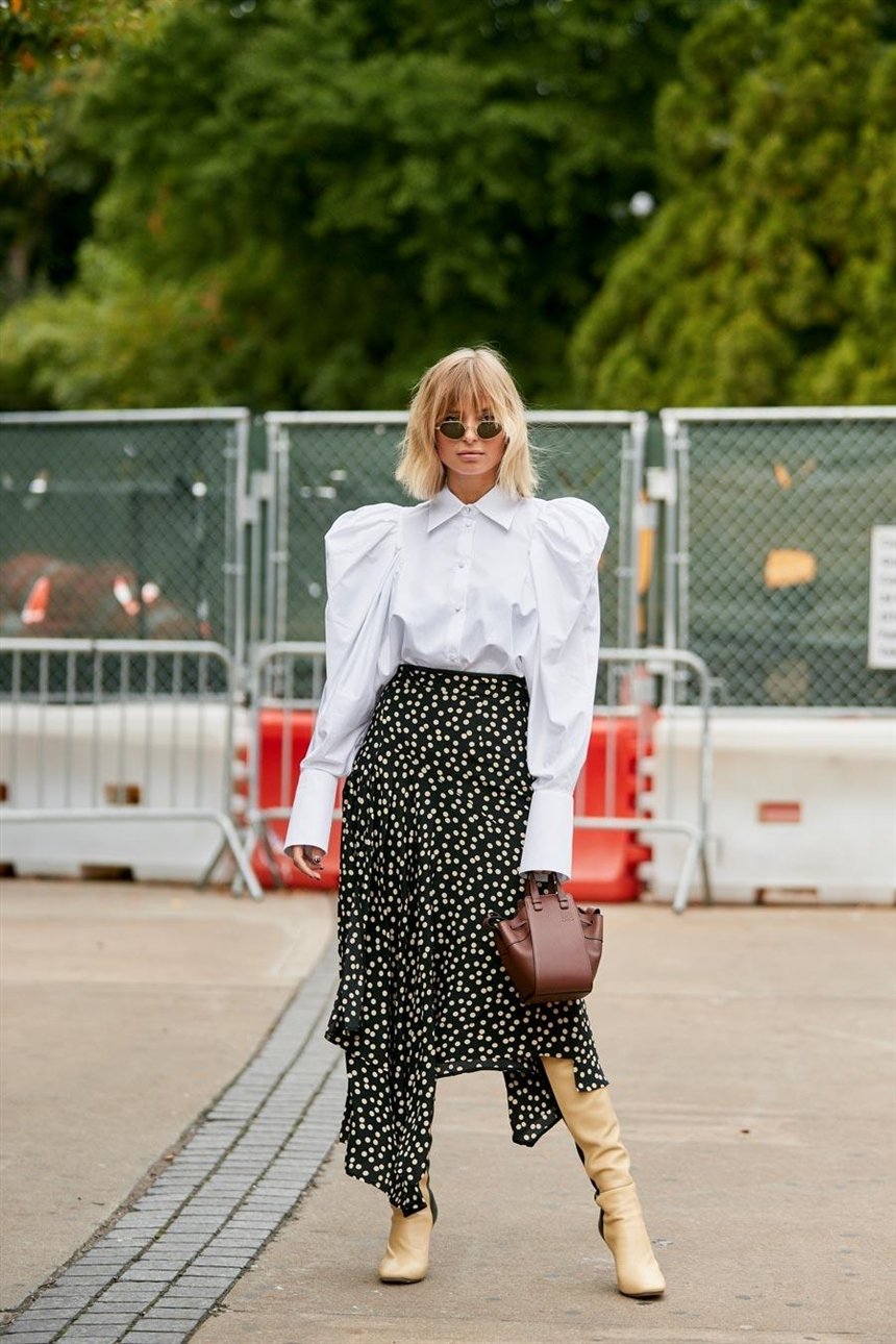 Если вы считаете себя настоящей модницей, то решитесь на юбку с принтом в горошек. Сейчас в моде пышные рукава, поэтому можете смело приобрести рубашку, как на фото. Сочетание двух оригинальных вещей под силу только рискованным девушкам, но результат того стоит. Поэтому вдохновляйтесь этим нарядом.