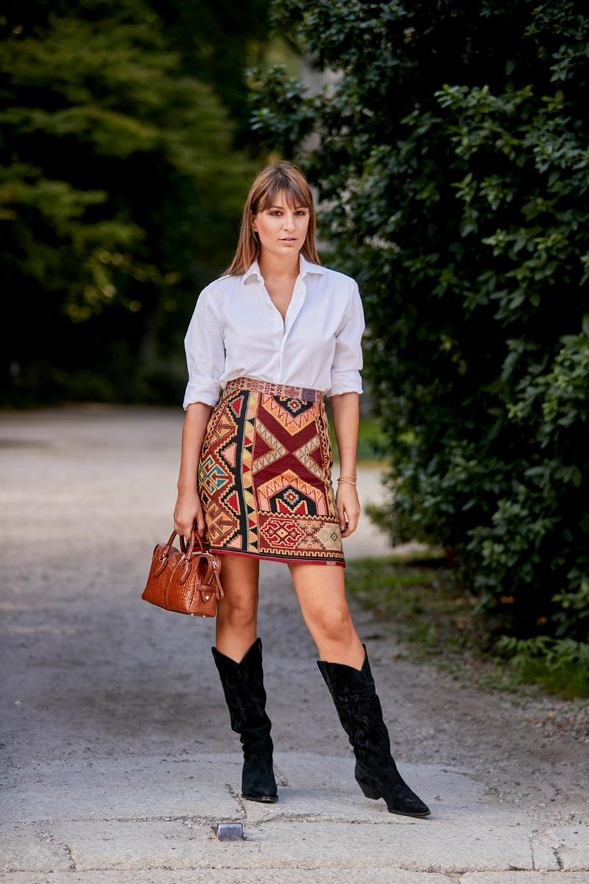 Ковбойские ботинки тоже вошли в список трендов сезона весна-лето 2020. Они смотрятся очень гармонично с яркими юбками и белыми рубашками. Посмотрите на образ, что на фото, и убедитесь сами.