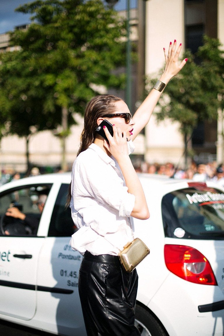 Белый и черный цвета в сочетании могут выглядеть очень сексуально. А все благодаря эффекту небрежности: один край рубашки вытянут из-за пояса, пуговицы рубашки наполовину открыты и видно часть черного бюстгальтера. Очень комфортный, стильный и сексуальный образ из базовых вещей гардероба. И не нужно никаких сумасшедших тенденций.