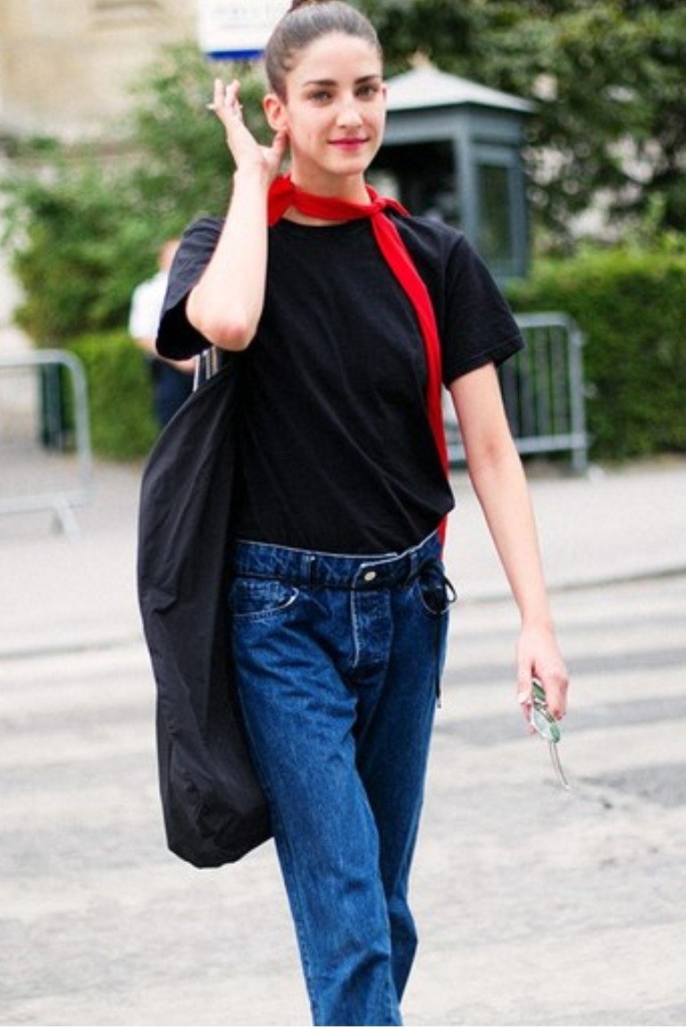 Посмотрите на образ, что на фото. Видите, как небрежно и как будто случайно завязан красный платок на шее? Ваш образ не должен быть идеально подготовленным. Дайте ему свободу, создайте небольшой эффект небрежности.
