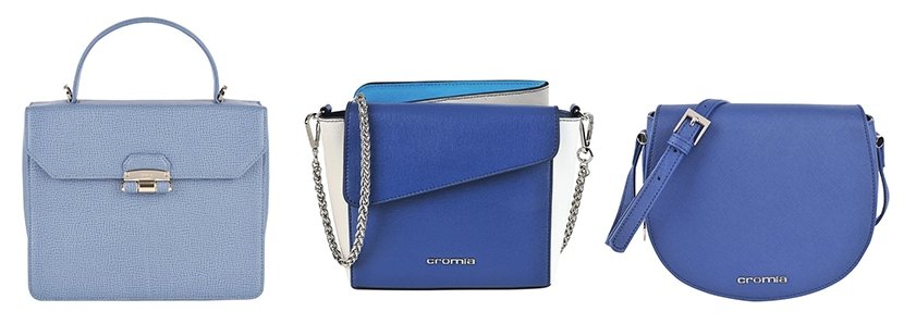 Второй блок состоит из интенсивного синего и небесного голубого оттенка. Природа будто умышленно создала теплые времена года, чтобы у нас было время насладиться водной палитрой. Образ с подобной сумкой выглядит интригующе, когда в нём присутствуют противоположные и контрастные цвета: оранжевый, желтый, зеленый или красный.