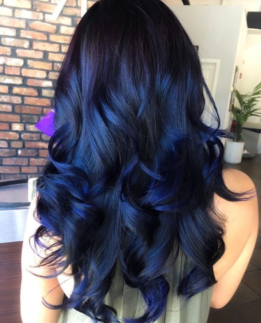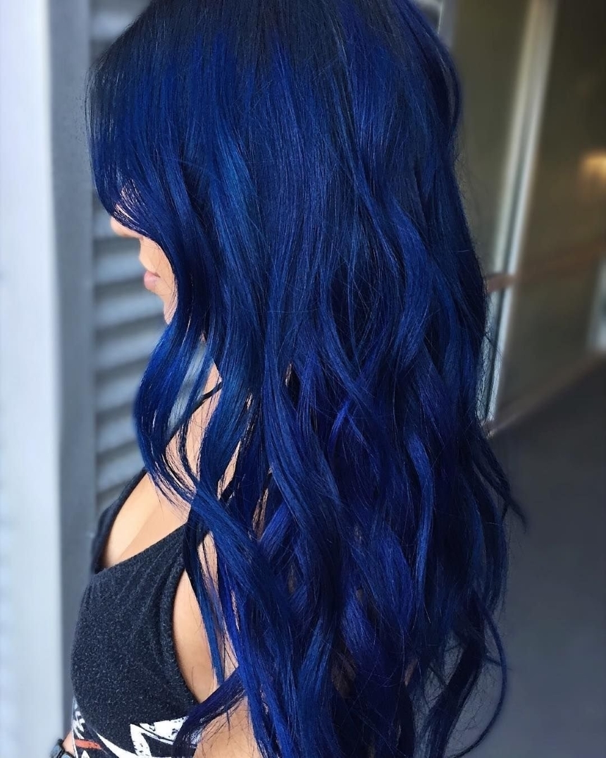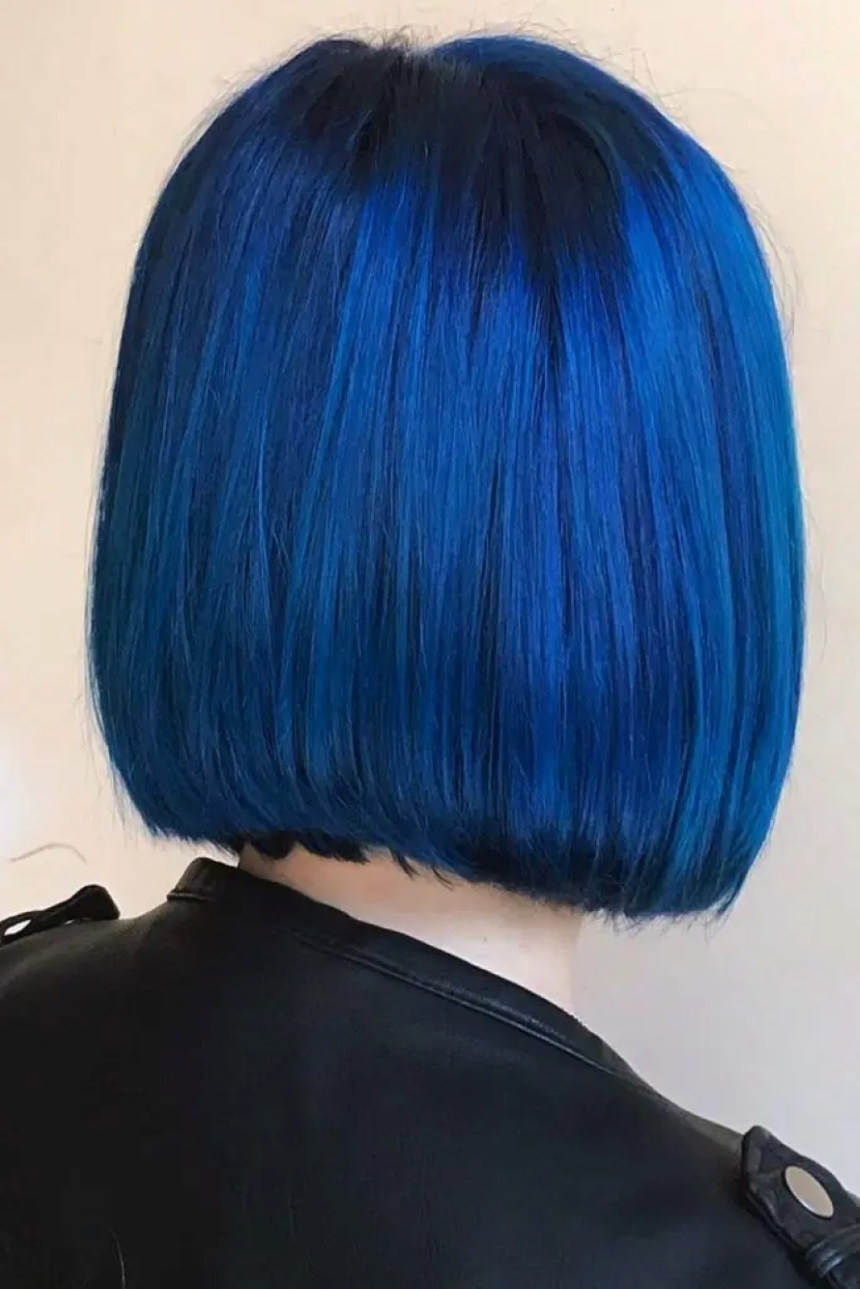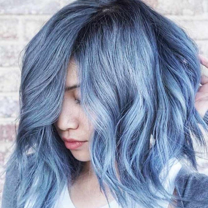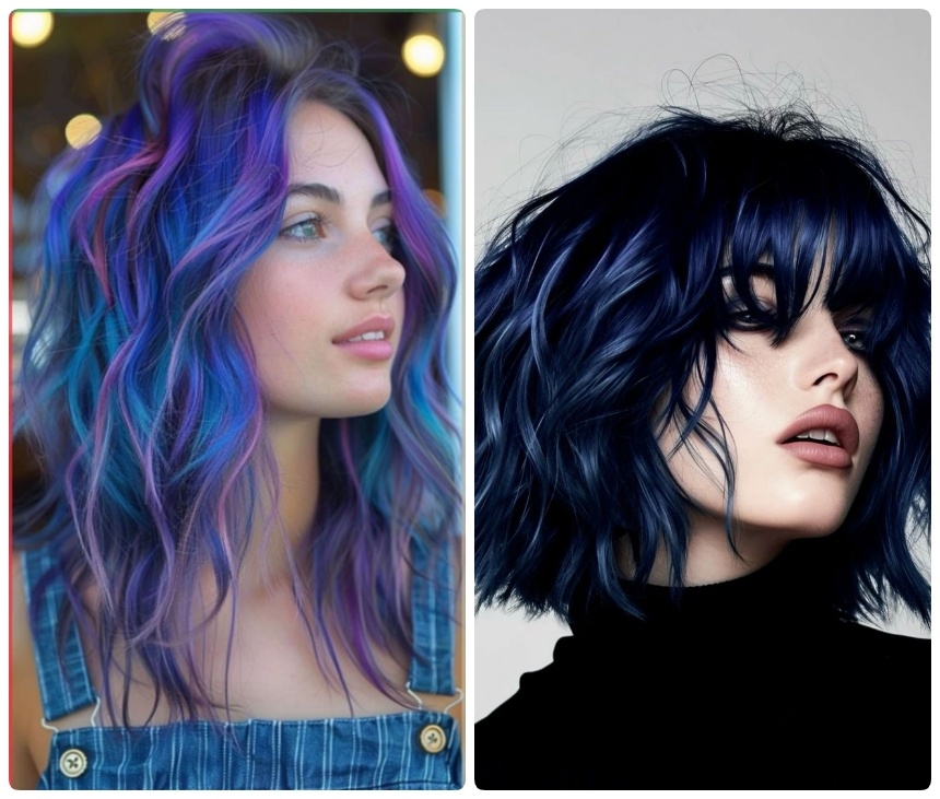 Темно-синий оттенок, напоминающий цвет джинсовой ткани, на волосах выглядит очень эффектно.
