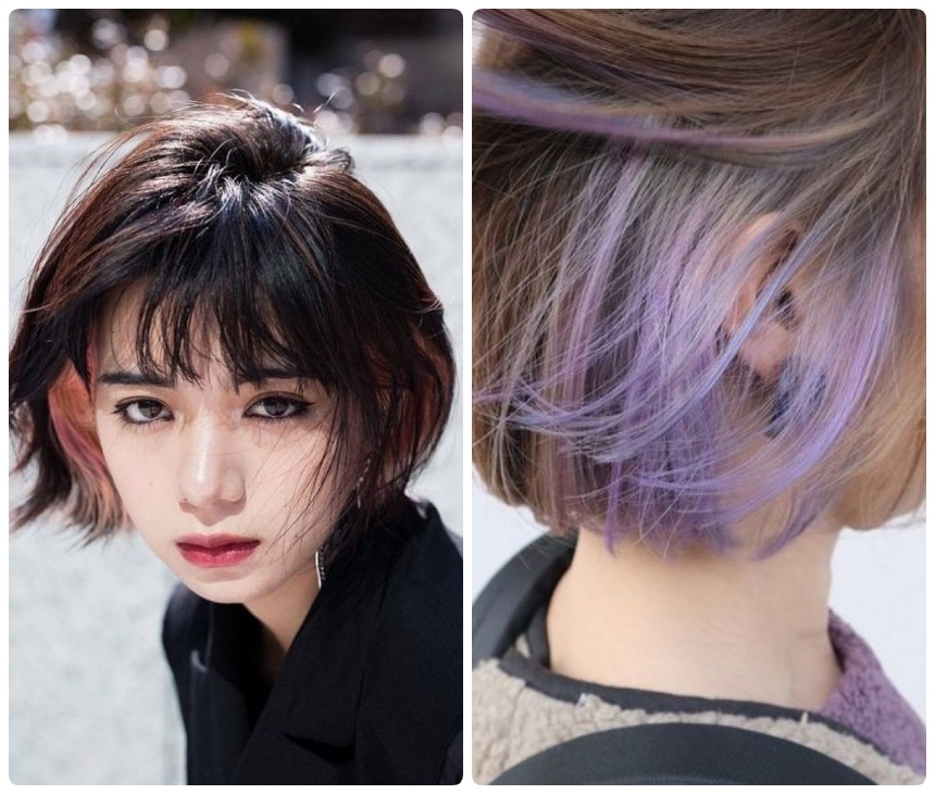 К скрытому окрашиванию часто прибегают люди, которые любят яркие цветные прядки, но не рискуют выставлять их напоказ. Такой вид окрашивания можно совмещать даже со строгим дресс-кодом. Нижние пряди волос красят в яркие цвета, а верхние остаются естественными. Таким образом можно и прятать модное окрашивание, и показывать его, собрав волосы в прическу. Именно благодаря этому фактору скрытое окрашивание всегда будет актуальным и популярным.