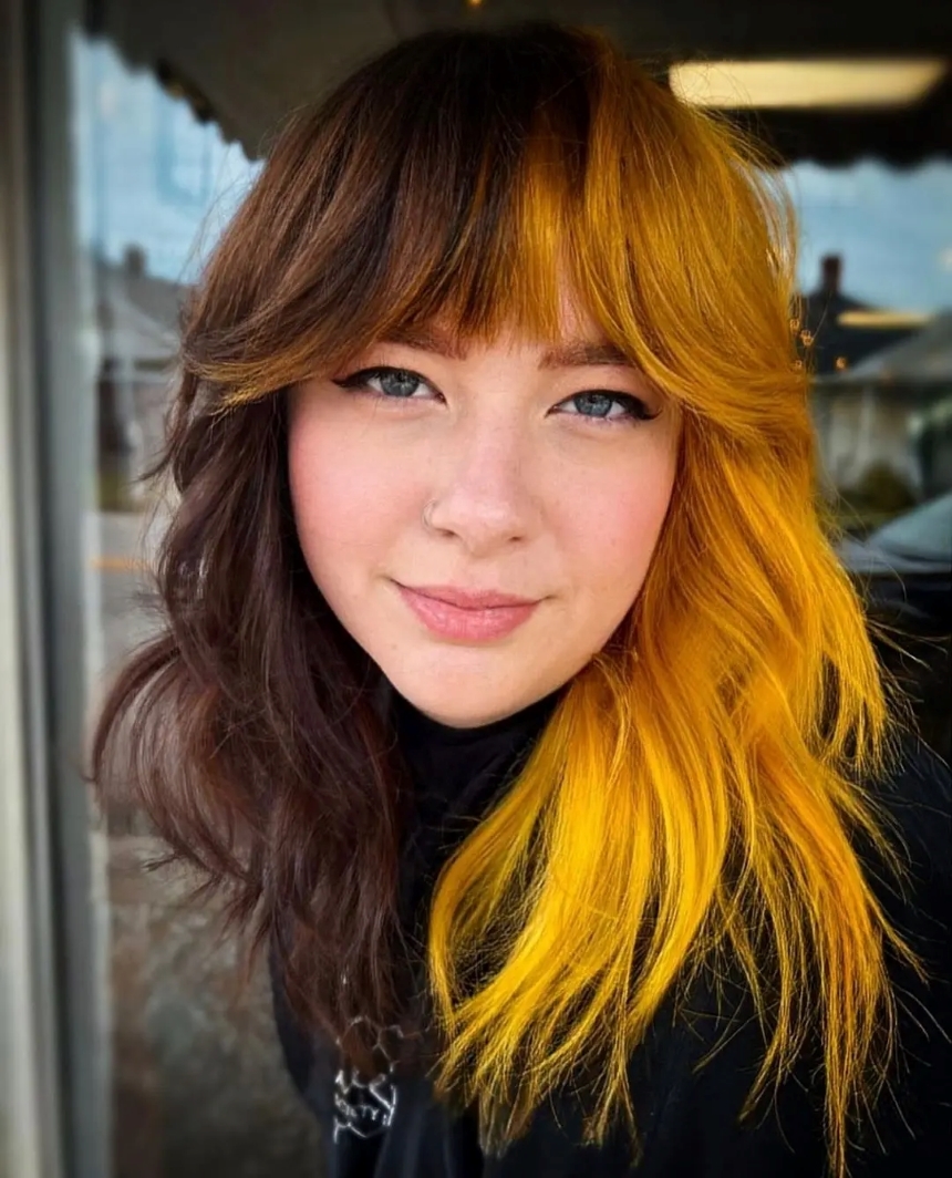 Оригинальная и привлекающая внимание техника окрашивания, при которой волосы на одной стороне головы красят в желтый цвет. Такой подход позволит создать плавный переход между цветами и добавит объема волосам. Этот вариант окрашивания подойдет для смелых и уверенных в себе людей, которые не боятся экспериментировать со своим стилем.