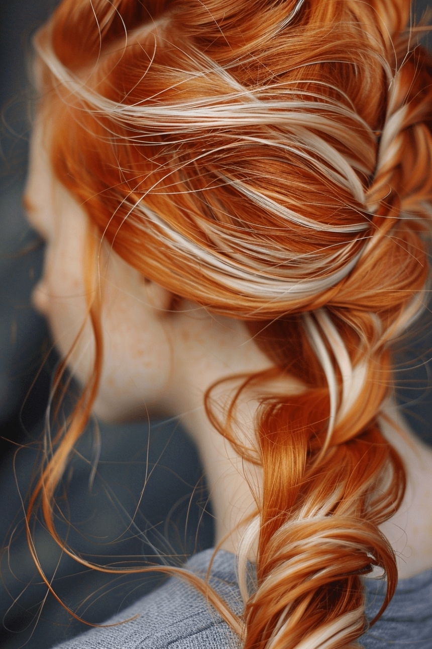 Желтоватые или белые прядки, словно солнечные лучики, освежают прическу. Рыжий цвет и так приковывает взор, а с такими солнечными и бликами, и подавно!