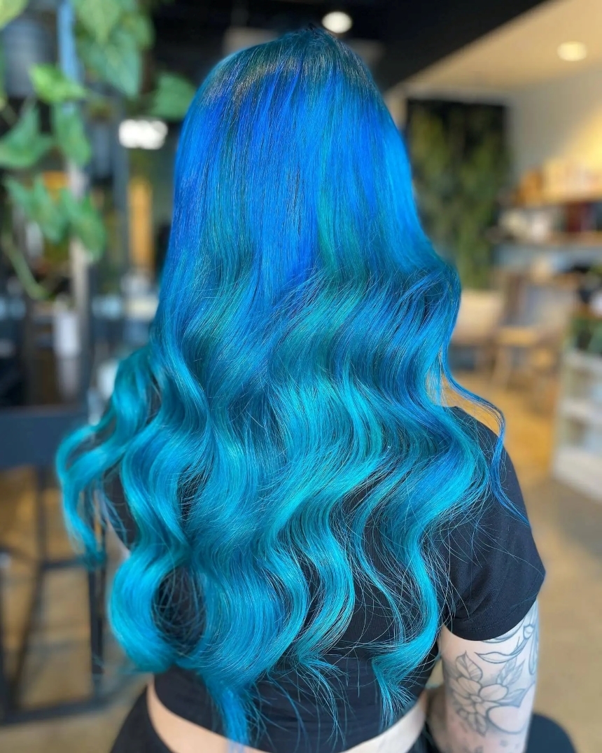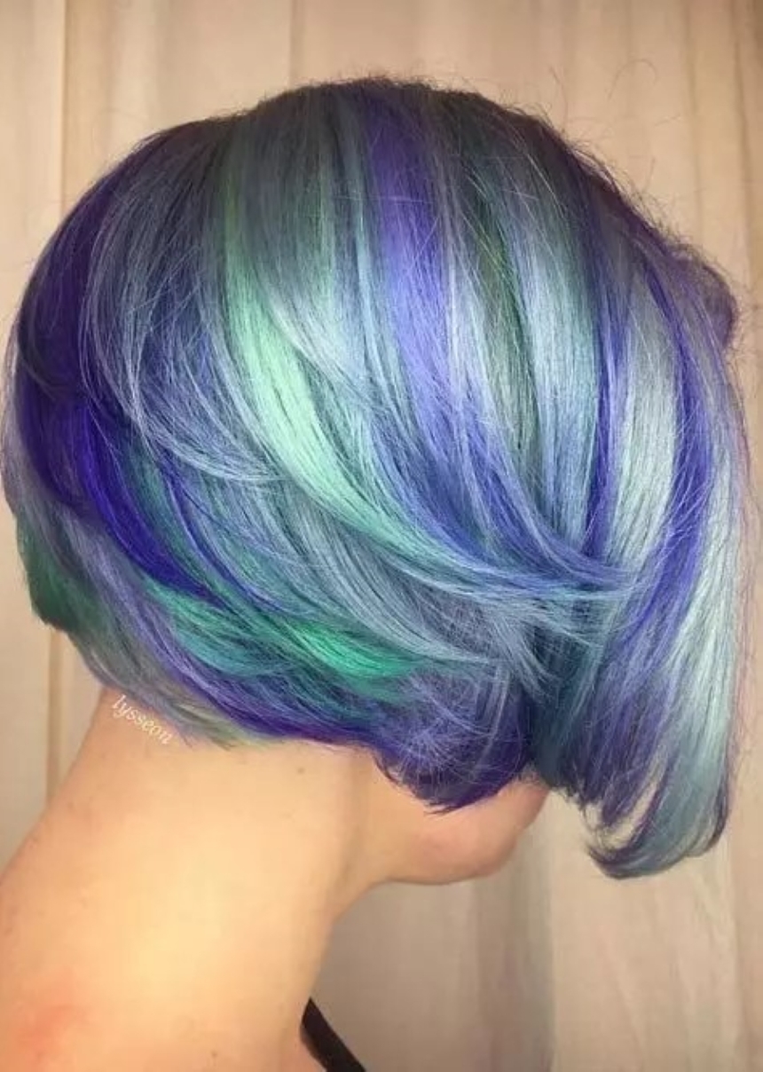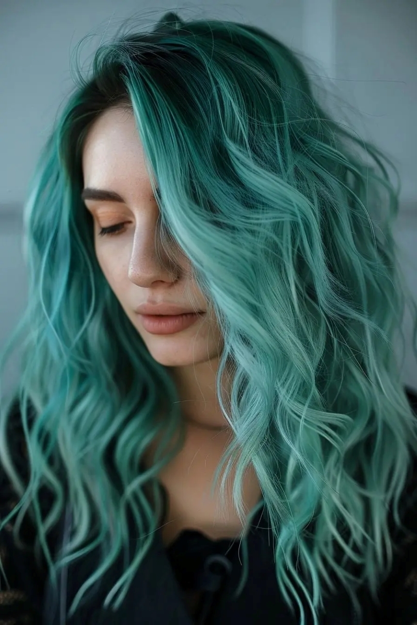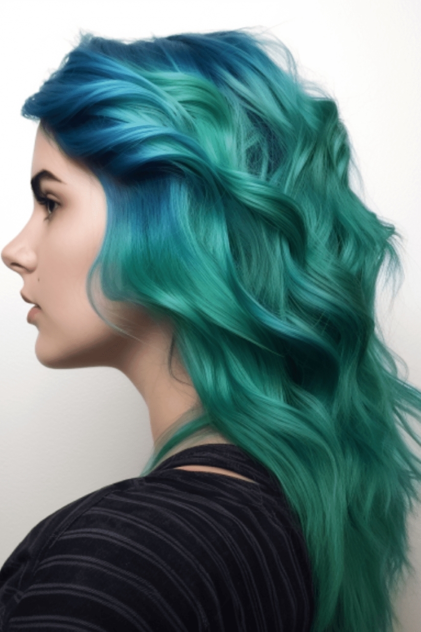 Сочетание синего и зеленого оттенков позволяет получить разнообразные прядки в волосах, от светлого аквамарина до глубокого изумруда.