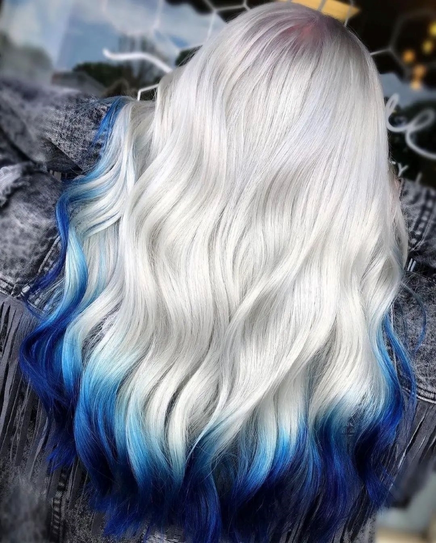 Добавление синих кончиков или прядей на светлые волосы — отличный вариант для небольших изменений в образе. Очень красиво такое сочетание выглядит на волнистых волосах.