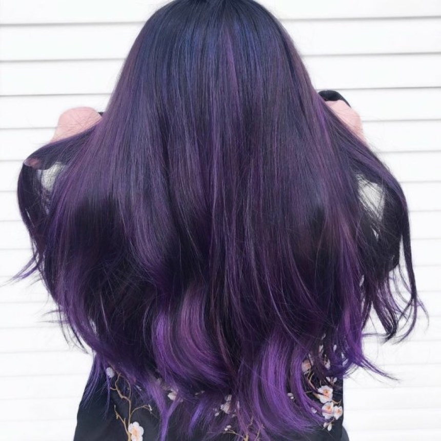 Темноволосые девушки при таком подходе обращают внимание на холодные цвета — синий, бордовый, фиолетовый. Выбирая эти оттенки, можно не обесцвечивать волосы, предохраняя их от лишнего агрессивного воздействия.