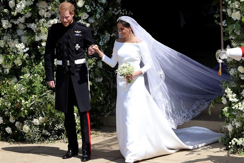 Герцогиня Сассекская вышла замуж за принца Гарри в мае 2018 года. Эта свадьба стала самой ожидаемой, самой громкой, самой комментируемой, популярной и самой красивой свадьбой года. Она стала победительницей в рейтинге лучших свадеб 2018 года. Свадебное платье Меган по праву стало самым удивительным и желанным платьем года. Оно создано британским дизайнером Клэр Уэйт Келлер, креативным директором компании Givenchy. Фата, которую выбрала Меган, достигла пяти метров (намного меньше, чем традиционная королевская фата) и была пошита из шелка.