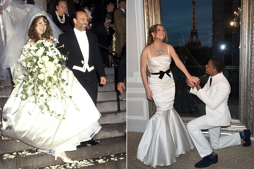 Платье Мерайи Керри, которое она выбрала для своей первой свадьбы с Томми Мотоллой, всегда можно увидеть в списках самых легендарных свадебный платьев, что стали историей. Справа вы увидите платье с ее второй свадьбы с Ником Кенноном, которая состоялась в Париже в 2012 году.