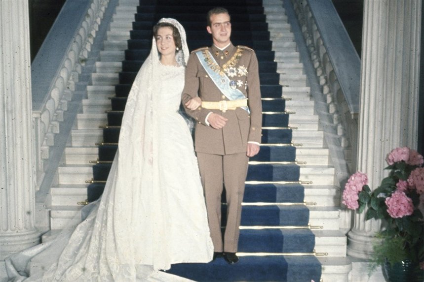 Еще одна знаменитая церемония бракосочетания! Королева София вышла замуж за Хуана Карлоса I в роскошном платье от дизайнера Джина Дессеса. Длинная фата была пошита брендом Gante. На голове у Софии была бриллиантовая тиара, которая досталась невесте от ее бабушки, принцессы Виктории.