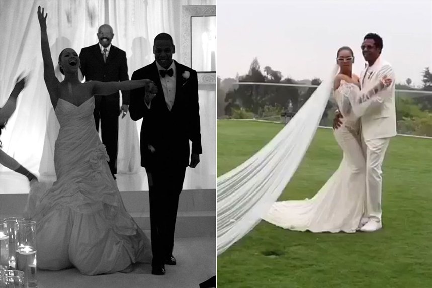 Бейонсе и рэпер Джей-Зи секретно поженились в 2008 году. Фото со свадьбы были обнародованы лишь через 6 лет! Несмотря на это, все были в восторге от длинного платья певицы с декольте в форме сердца и оригинальной юбкой, которую создала мама Бейонсе. Недавно пара возобновила церемонию и повторила клятвы. Справа вы видите платье от израильского дизайнера Галии Лахава.