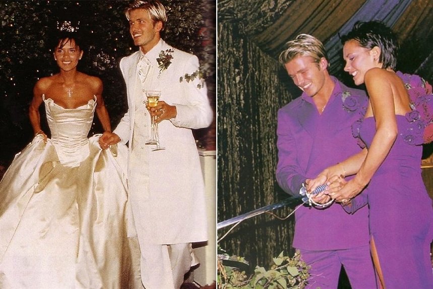 Свадьба Виктории и Дэвида состоялась в 1999 году. Невеста прошла через алтарь в классическом шелковом платье от Vera Wang. После самой церемонии они вышли к гостям в фиолетовых образах от дизайнера Антонио Берарди. Сейчас этот дизайн выглядит устаревшим, но на то время образы молодоженов выглядели просто сногсшибательно.