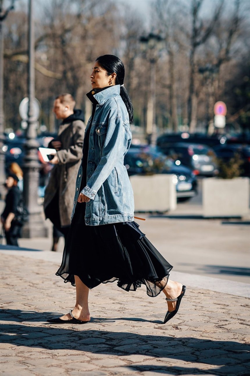 Новый вариант классической джинсовой куртки: очень длинная, с опущенными плечами и бледным джинсом. Это веяние 80-х годов, которое замечательно сочетается с длинными платьями или объемными юбками.