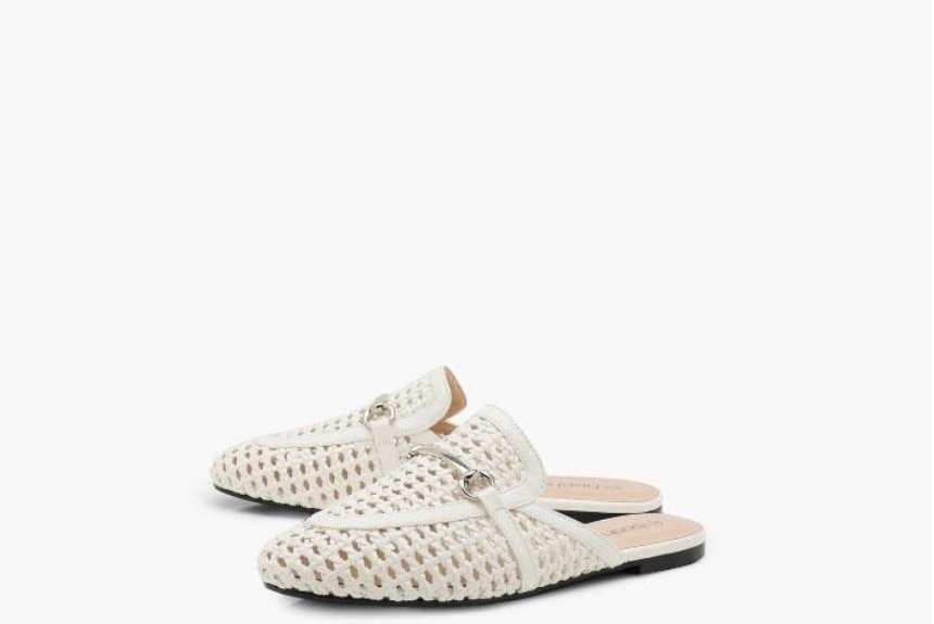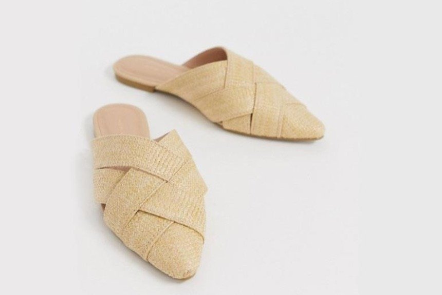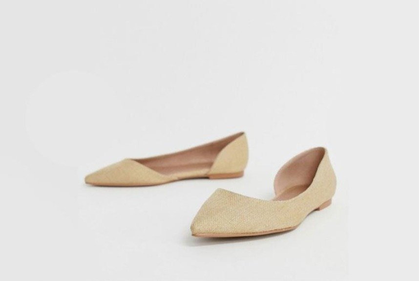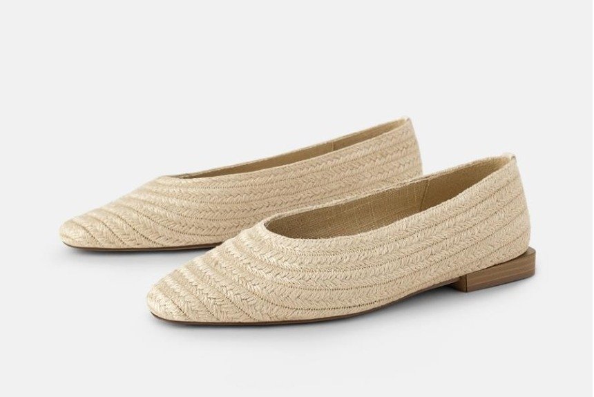 Еще один вариант комфортной летней обуви – балетки. Советуем искать только те, которые по цвету приближены к тону вашей кожи. Вот эта модель бежевого цвета, сделанная из соломы – очень стильный вариант! Неожиданный эффект создает нестандартный деревянный каблук.