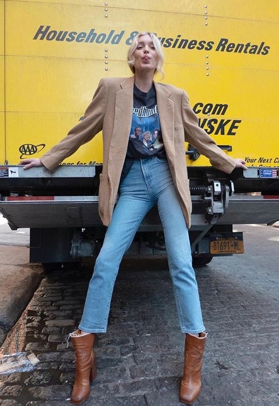 Если блузки и рубашки – не ваш стиль одежды, и вы ищете более неформальную и удобную альтернативу, чтобы сочетать эту вещь с джинсами, то этот образ со стильной футболкой точно будет вам по душе! Только не выбирайте слишком простые футболки! Возьмите с интересным принтом, надписью или с фото из фильма. Чтобы образ не казался небрежным, добавьте стильный пиджак и классические ботинки.