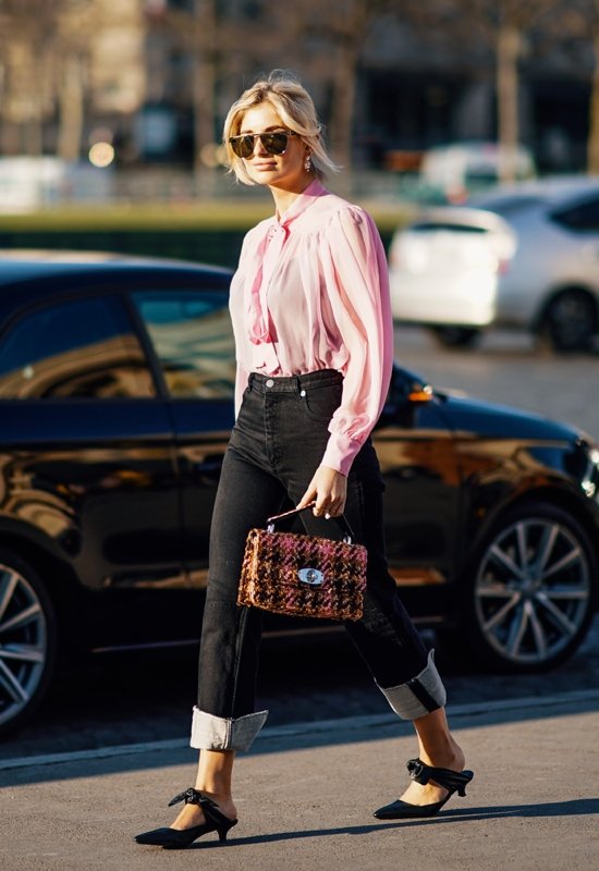 Это элегантный и даже формальный вариант, который тоже прекрасно сочетается с джинсами. Дизайн такой блузки может быть разный: от фасона с пышными рукавами, вырезом и нежной тканью, до блузки в темных тонах, застегнутой на все пуговицы. Посмотрите на фото и убедитесь сами! Сочетание розовой блузки с бантом на шее и темных джинсов создает одновременно романтичный и формальный образ! Выбирайте сумку с квадратным принтом в тон с блузкой.