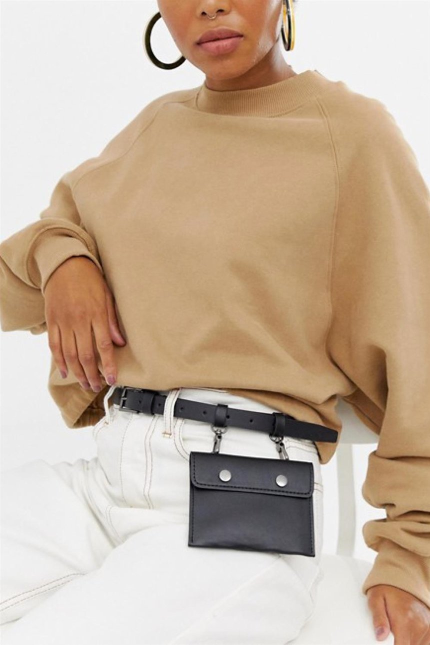 Считаете, что сумка-пояс – это слишком неординарно? Боитесь рисковать? Посмотрите на эту черную плоскую сумку, пришитую к поясу. Это идеальное дополнение к минималистичному образу. Кроме того, можно искать похожие модели с бахромой. И не обязательно, чтобы сумка была прямоугольной. Ищите разные формы и текстуры тканей.