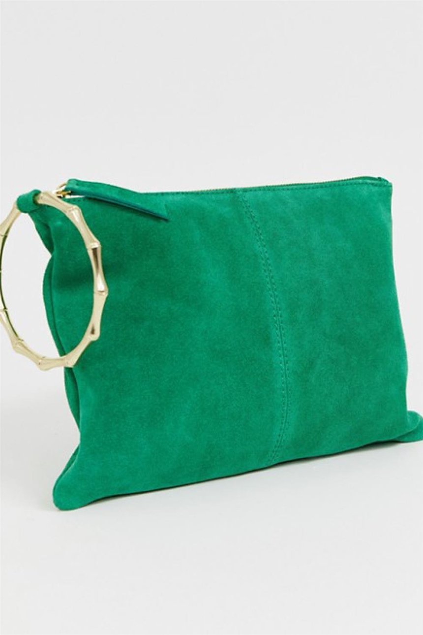 Еще одна модель из замши. Выглядит очень по-весеннему. Ручка из бамбука и зеленая замша придают образу женственность и свежесть.