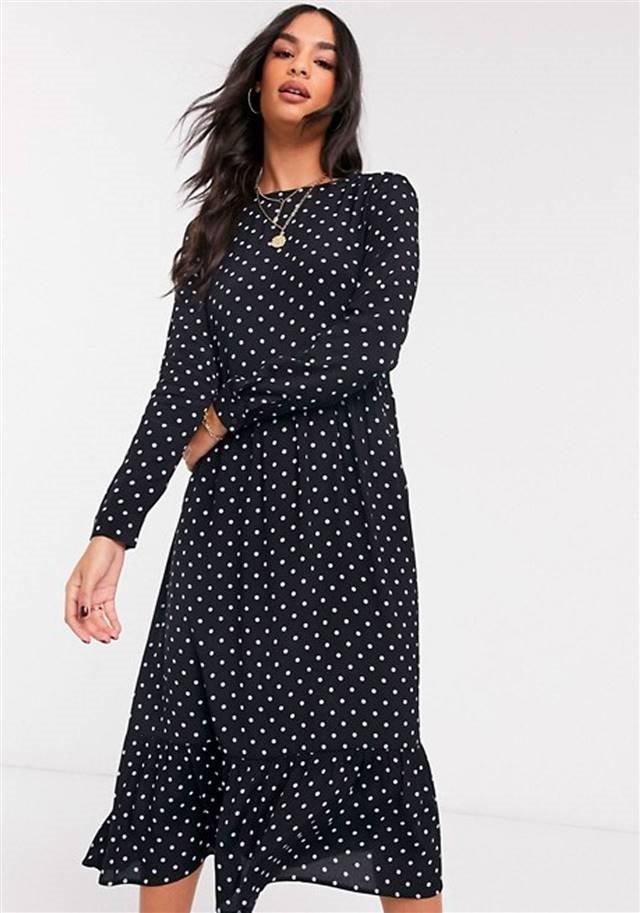Простой дизайн компенсируется черно-белым принтом в горошек и длинными рукавами, которые придают платью элегантности. Это замечательный вариант для выхода на работу, романтического ужина и даже торжественного мероприятия.