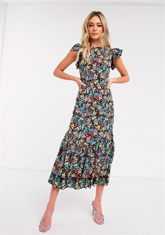 Платье миди с оборками на рукавах и юбке – идеальный вариант. И снова цветочный принт украшает трендовое весеннее платье. Фасон для девушек, которые любят инфантильный стиль.