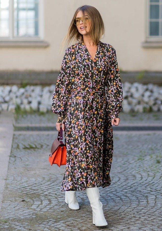 Платье и ботинки – это нестандартная комбинация. В последнее время в моде было сочетание кедов/кроссовок и романтических платьев. Сейчас можно носить такие платья с ботинками с высоким голенищем. Желательно, чтобы обувь была светлого цвета. Образ подходит как для дневного, так и для вечернего выхода.