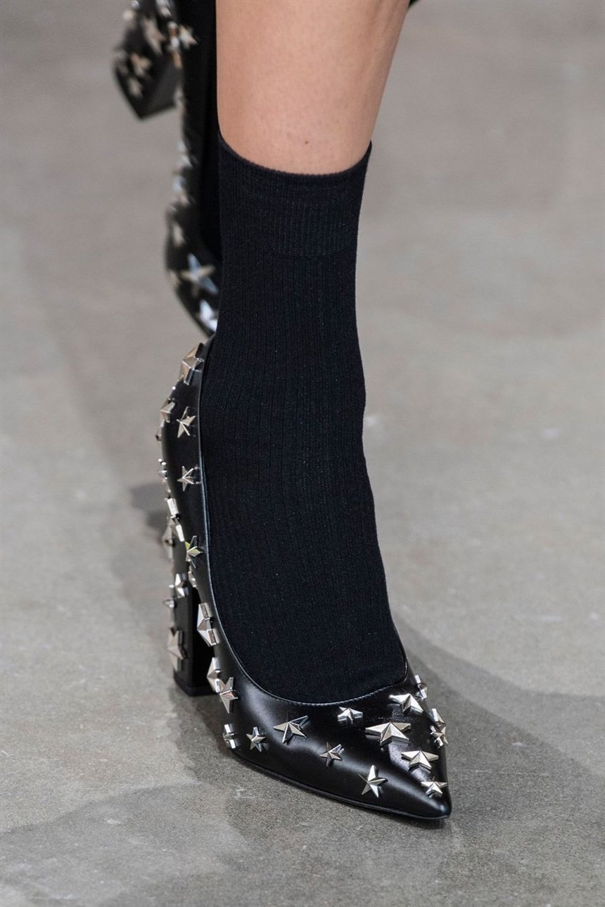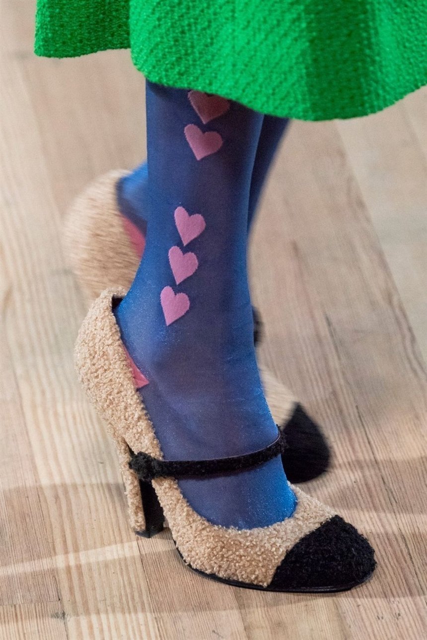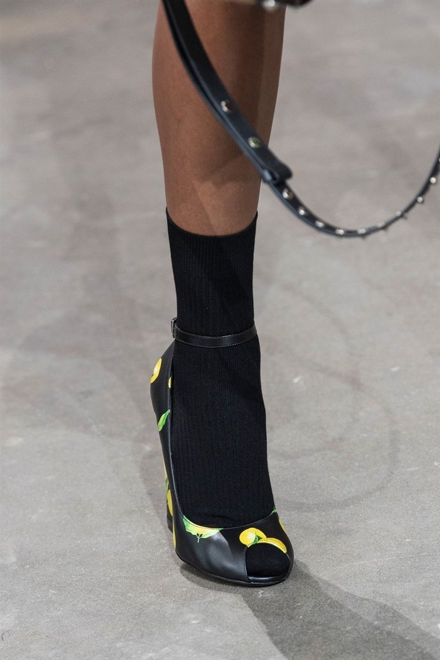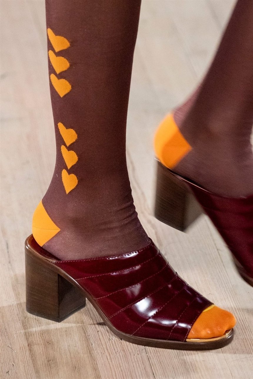 Этот бренд доказал, что босоножки можно носить с гольфами или колготами. Сочетайте однотонные босоножки на квадратном каблуке с яркими колготами.