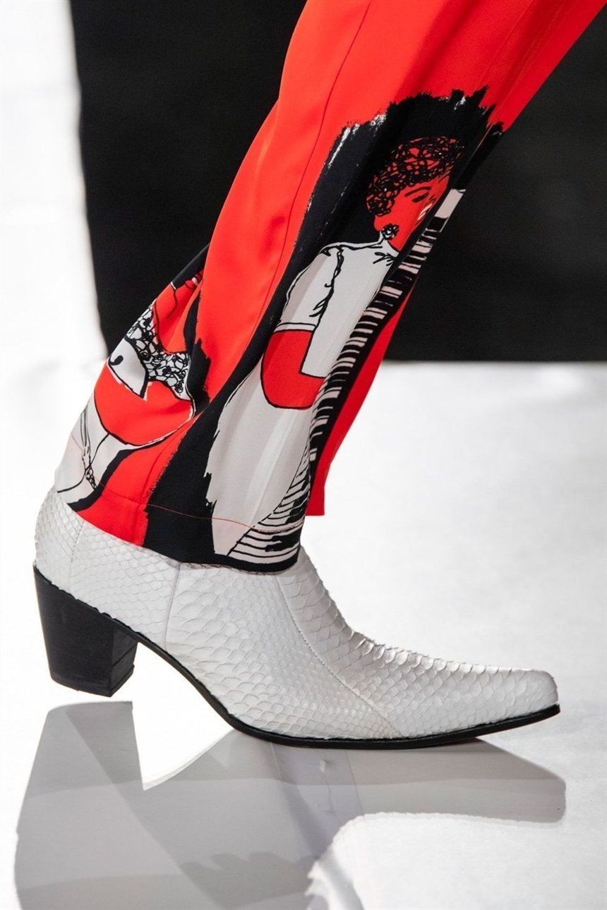 Белые ботинки с эффектом кожи крокодила. Такую обувь в ковбойском стиле нужно сочетать с яркими штанами.