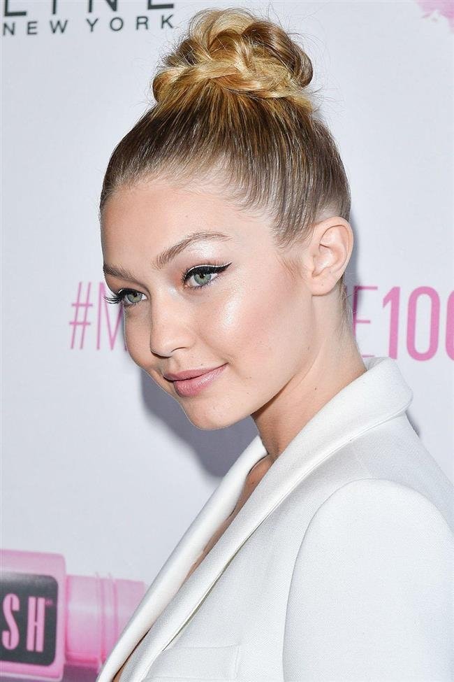 Теперь поговорим о прическах. Мы нашли самый идеальный вариант для круглой формы лица. Кроме того, это одна из самых популярных причесок для красной дорожки. Высокий, затянутый пучок – это то, что нужно, если хотите вытянуть лицо. Джиджи Хадид знает это наверняка. Можете повторить ее вариант со стильной косичкой в пучке.