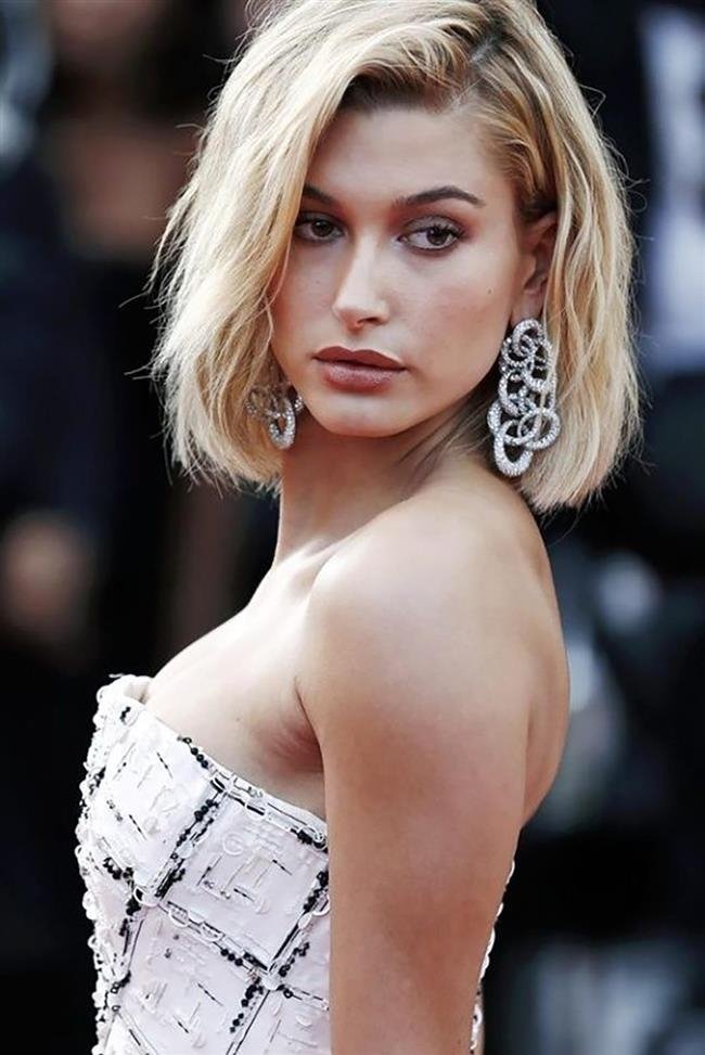 Если вы не любите прямые стрижки, как предыдущая, то рекомендуем вам вот такой объемный вариант от Хейли Болдуин. Это стрижка длиной чуть выше подбородка с эффектом небрежности и боковым пробором. Важно сохранять этот пробор, ведь именно он делает ваше лицо визуально удлиненным. Легкие, небрежные кудри – это тренд сезона, поэтому обратите особое внимание на эту укладку.