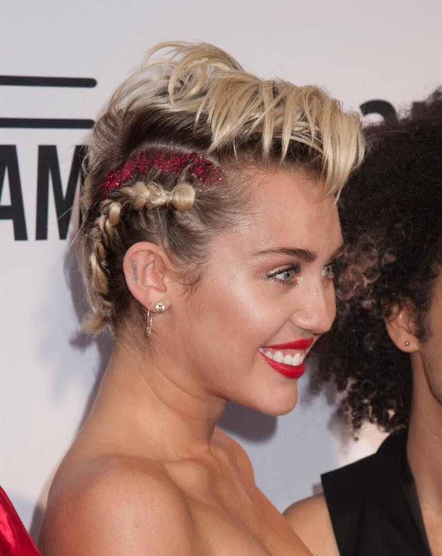 Певица Майли Сайрус решилась на оригинальное сочетание: боковые косички, блестки и объемная укладка на макушке. Это очень молодежный, бунтарский вариант, который больше подойдет для шумной вечеринки.