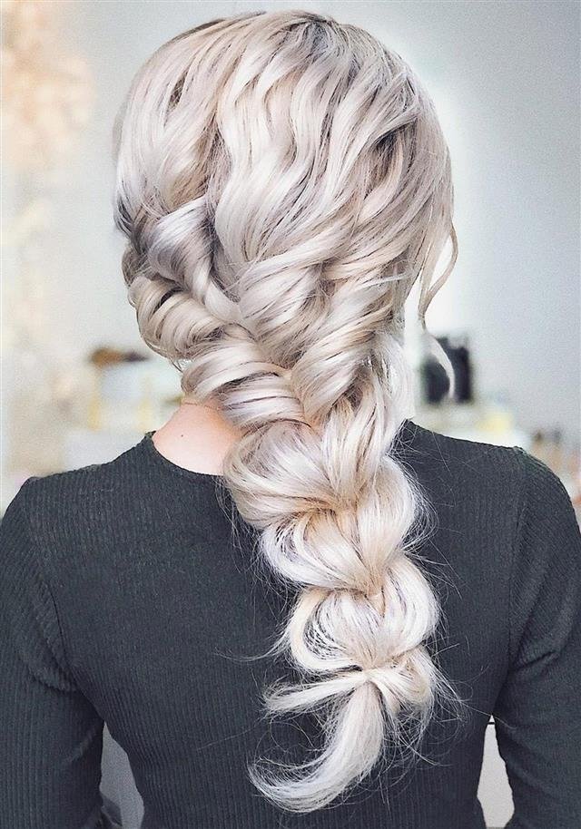 Не беспокойтесь, это не очень сложная прическа, как может показаться на первый взгляд. Начать нужно с текстуры волос: сделайте легкие кудри и небольшой начес на макушке. Потом отделите прядь сбоку и заплетите косичку навыворот от корней волос. Чтобы придать косичке 3D эффект, просто немного вытяните каждую часть плетения. Доплетите прядь до конца и закрепите резинкой. Соберите все волосы и конец косички в хвост, но не забудьте оставить несколько прядей, чтобы они обрамляли лицо.