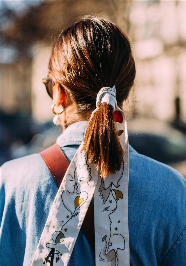 Конечно, если вы ищете совсем простую прическу, то вам подойдет именно этот вариант. Но без аксессуаров тут не обойтись. Приобретите платок со стильным принтом и обвяжите ним основу хвоста, чтобы кончики платка свободно спадали на спину.