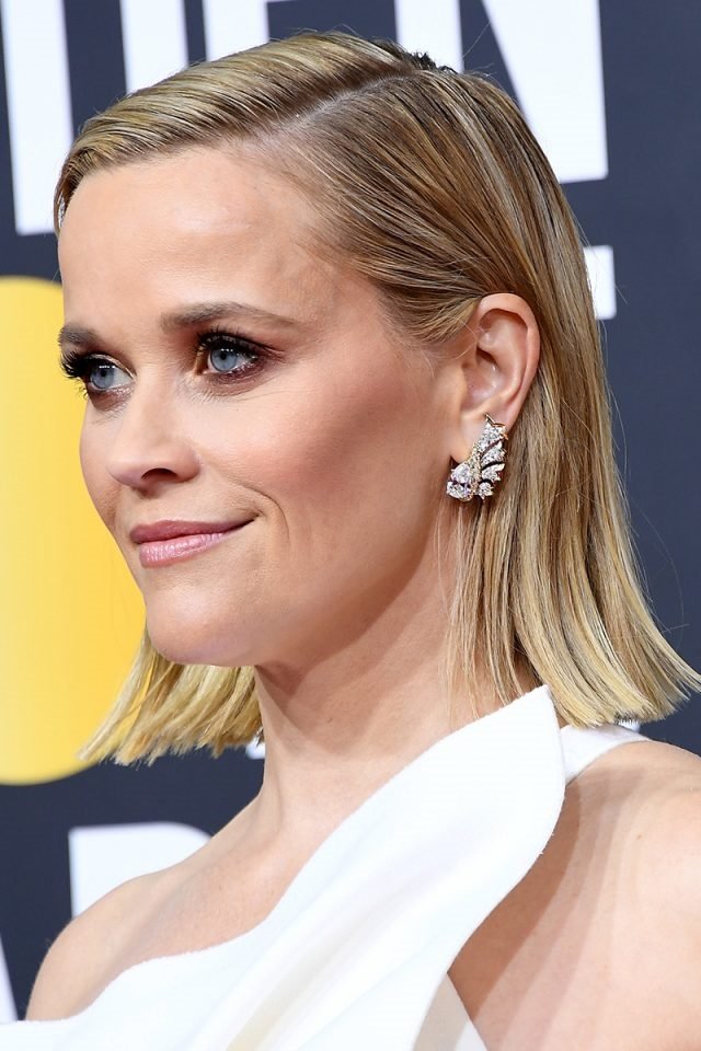 Актриса всегда остается верна своему любимому цвету блонд (конечно, помимо некоторых работ в кино, где она появляется в неожиданных образах). Чтобы покорить всех на церемонии "Золотой глобус-2020", актриса сделала прическу с мокрым эффектом, боковым пробором и затемненными корнями. Риз Уизерспун была номинирована в категории "лучшая женская роль в сериале-драма".