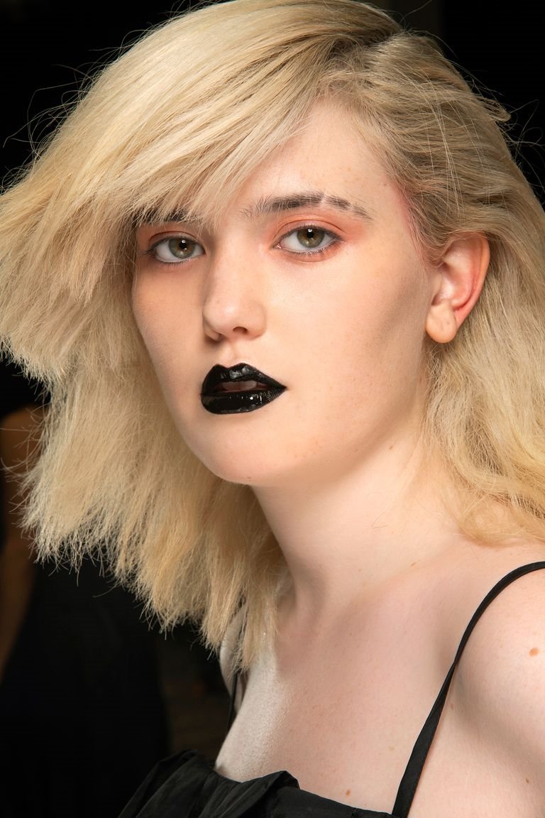 Бренд Marques’Almeida предлагает дикий образ с боковым пробором и сильным начесом.