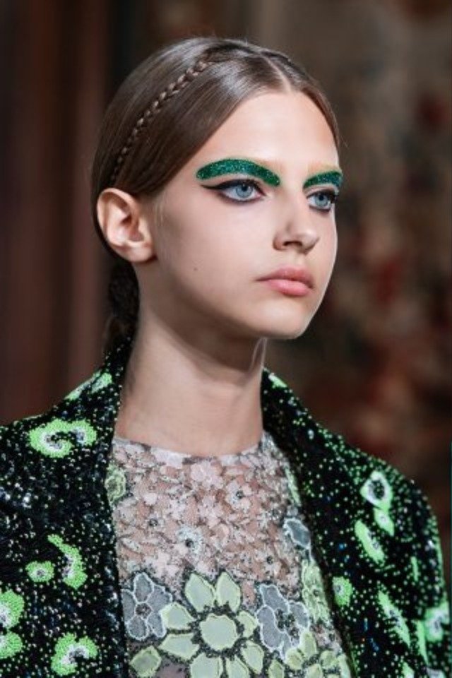 И снова эксперимент от Кары Делевинь. Она сделала небольшой начес на макушке и собрала передние волосы сзади, как мальвинку. Остальные волосы и кончик мальвинки она тоже собрала в низкий хвост. Два пробора по бокам Кара Делевинь закрыла цветными резинками, цвет которых перекликался с тенями и нарядом модели. Чем не идеальный образ для свадьбы в стиле хиппи?